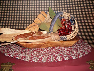 This is my dining room table display .I bought that beautiful coverlet from Tricia over at Hillcrest Home Prims and I love it.So if you are looking for some nice things check her out .