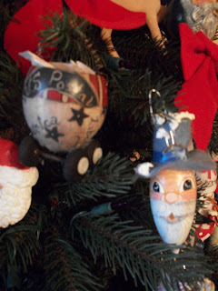 He was wearing these little shoes when he took his first steps.If you were here in person, looking at my tree you would find a few of his favorite pacifiers.An egg that came from a chicken his fourth grade class hatched and he brought home.I will never forget how huge the box was that he was toting this one little chick home in either.It was all he could do to reach around it to hold it securely. It took me forever to get him to let me take the chicken outside ,I am talking months!