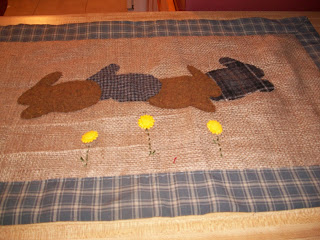 A wonderful bunny mat on burlap and trimmed in beautiful fabric!This thing is huge and check out those cute  flower buttons!