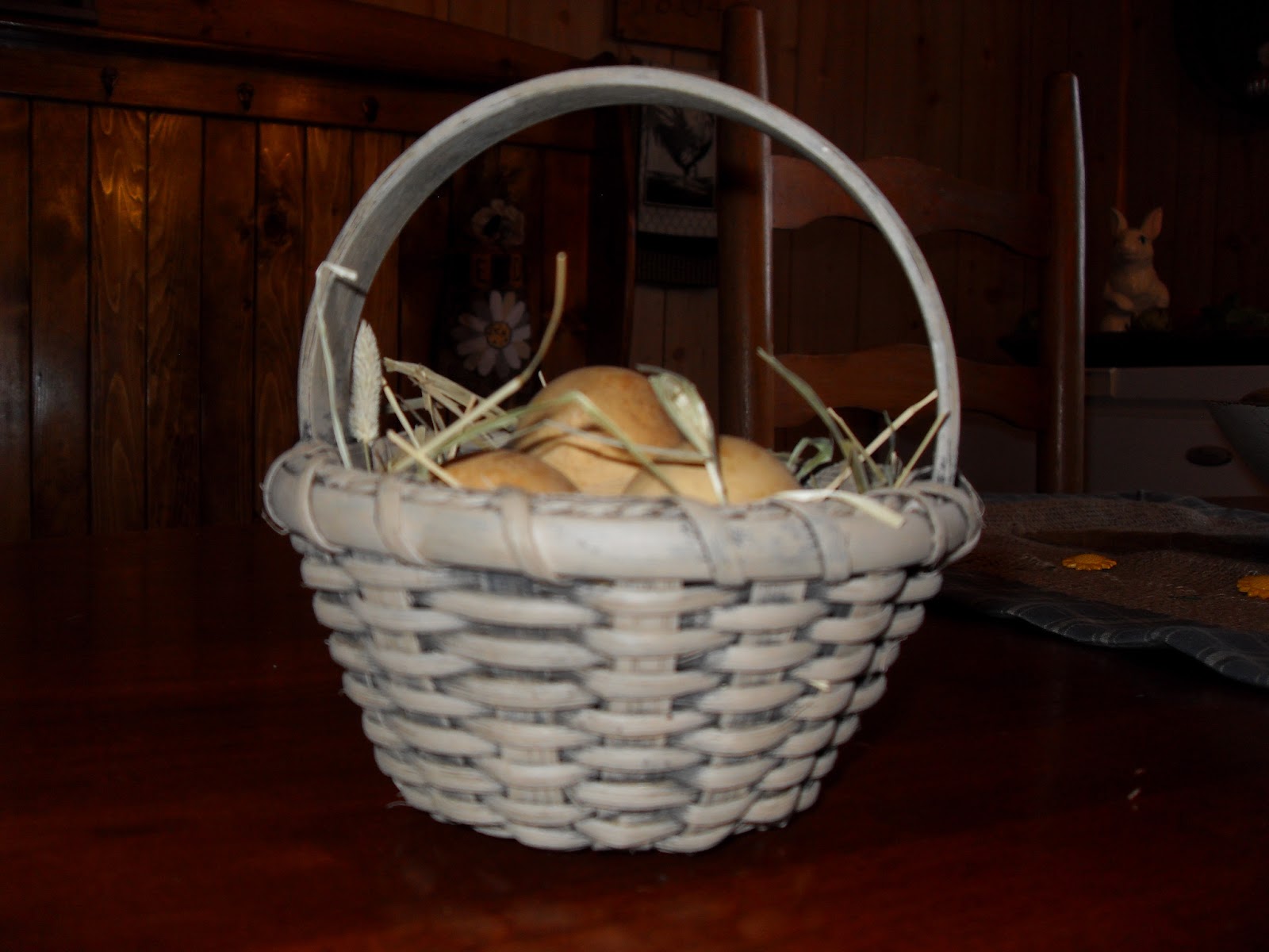 Now back to my wonderful basket.Friends, I am sure most of you are familiar with Ann and her wonderful blog 1803 Ohio Farm Baskets and her other blog A Hole in the Basket Primitives but if not please check them both out.Ann is wonderfully talented in basket weaving,cross stitching and so many more crafts and is just the sweetest lady.Baskets have long been a favorite thing to collect and I am so in love with my little basket and the sweet egg gourds! The quality of this basket is outstanding and if you have a thing for baskets then you really should check out Ann's Etsy.I have a few of her baskets on my wish list.LOL! Thank you so much Ann for your generosity and please forgive my tardy post.Here are some pics of my sweet basket...