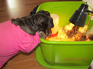 They have since moved to a larger box and have much more room. Gretchen is used to different critters being inside and usually takes it all in stride but these chicks have her torn up.She sits and cries and when they were in this tote she would look at them and sound so pitiful.I don't know if it is the chirping or what but she has had me getting up at night just so she can check on them.