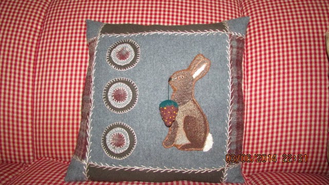 I made this pillow by first punching the rabbit and then adding it to the wool background with the coordinating wool pennies.I then did the feather stitch to hide the seams where I added the wool strips around the rabbit background.